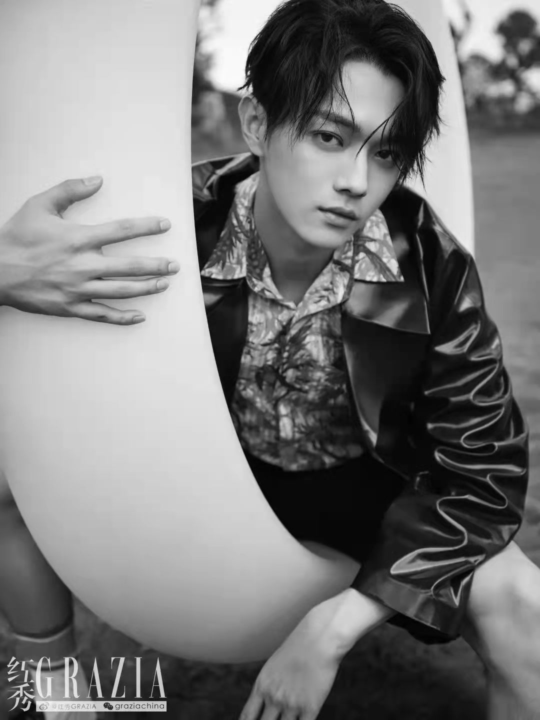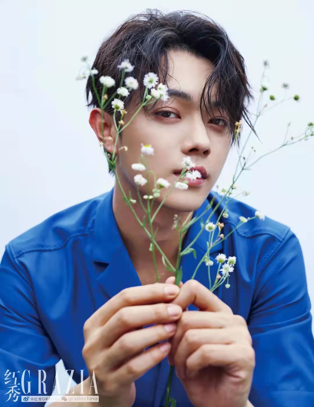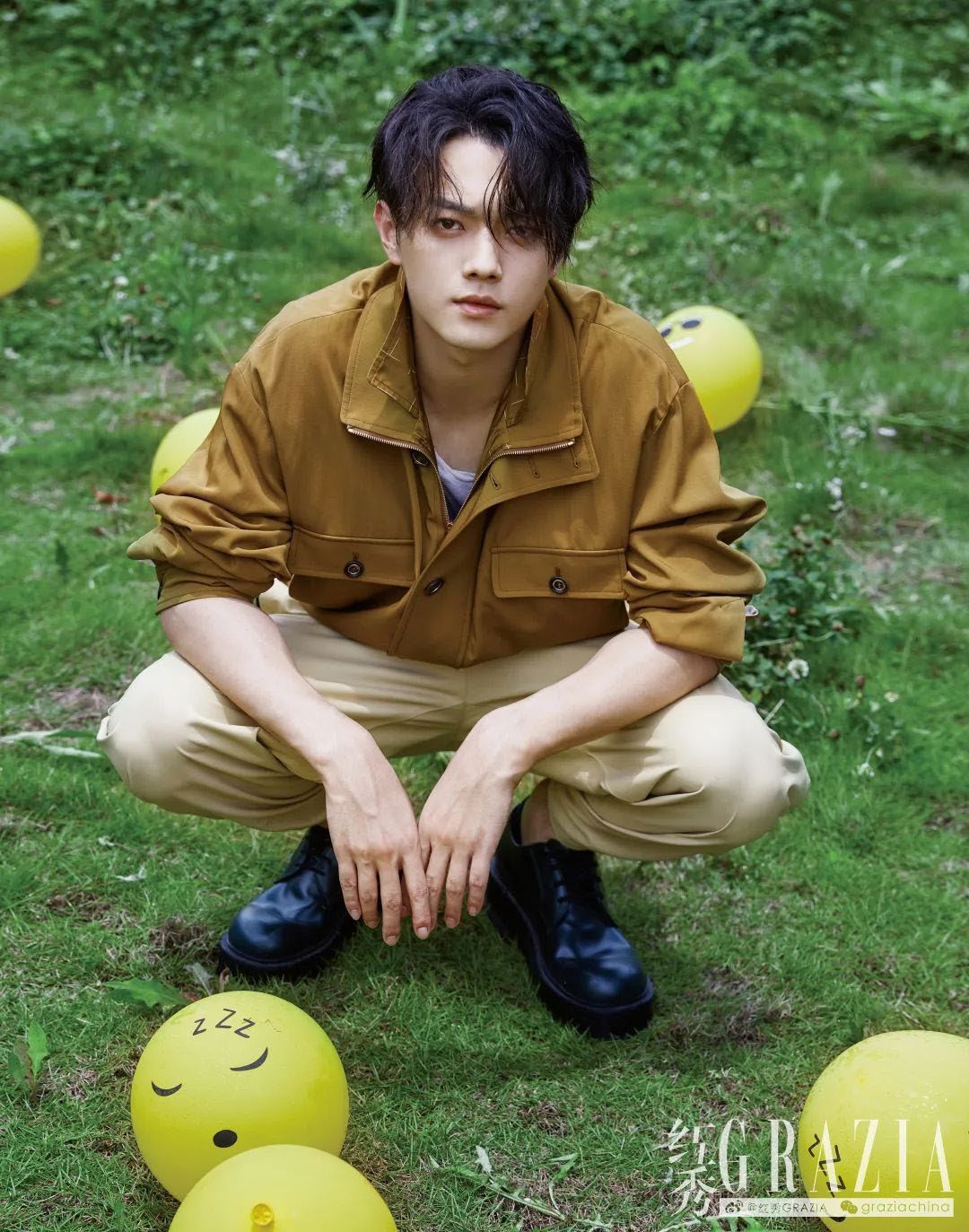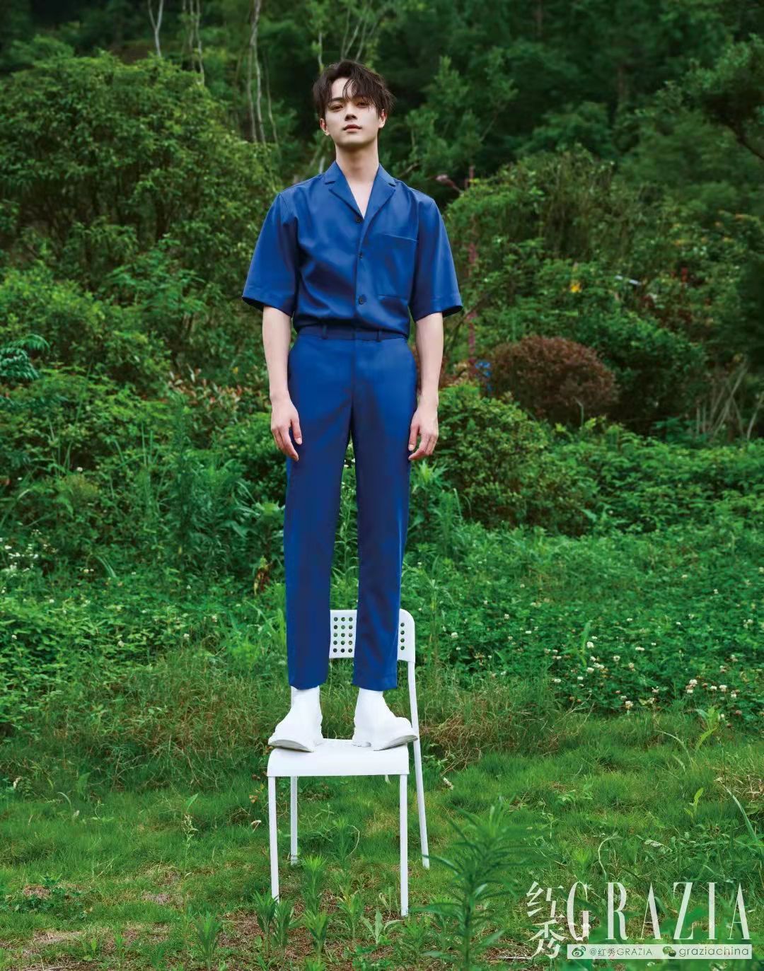 回来是为了《千古玦尘》。变回古代人,许凯身上又带了些表演惯性。少用手势,不太做表情,杂志拍摄当天,我们带着他在横店附近的草地“摸爬滚打”,他还是一副古装戏里翩翩公子的姿态,样貌精致,皮肤白净,坐得笔直,站得端正。后来才知道,这是“忙碌拍戏日程里相对放松的一天”,但也只是“相对”——和大自然亲密接触后,这位新上任的法国娇兰品牌大使还得赶去拍摄品牌物料。